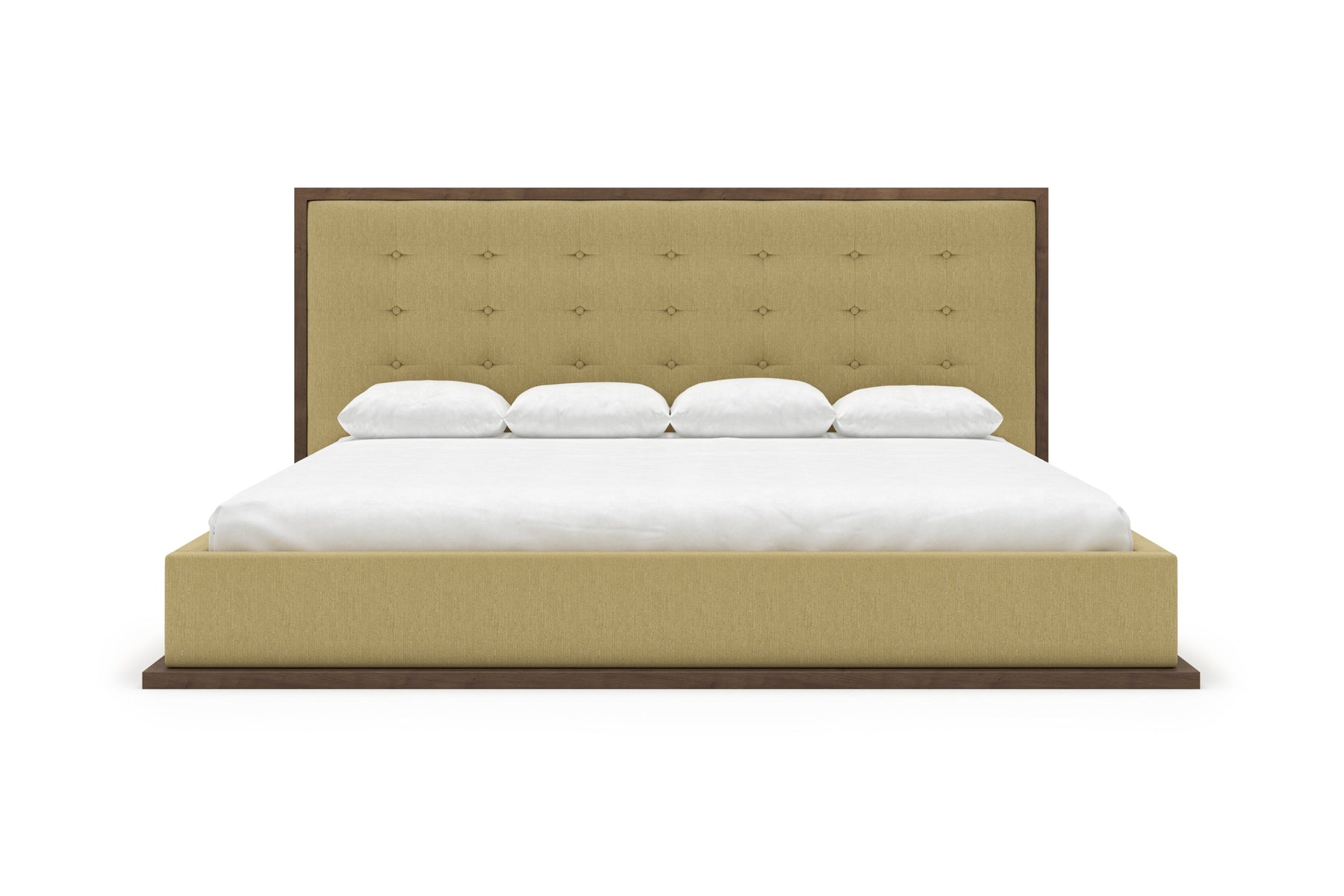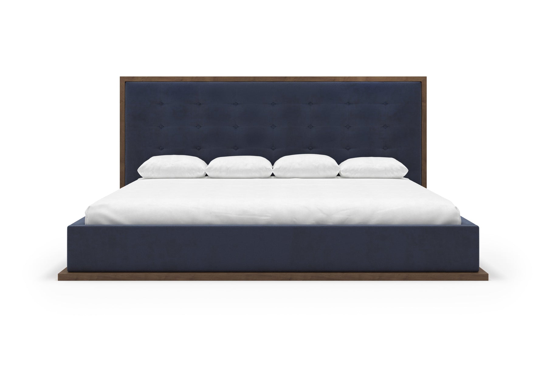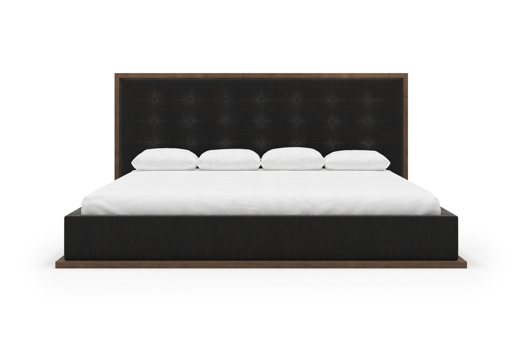 The headboard, framed by a rich, wood border, contrasts beautifully with the plush, tufted upholstery, creating a sophisticated centerpiece in any bedroom.