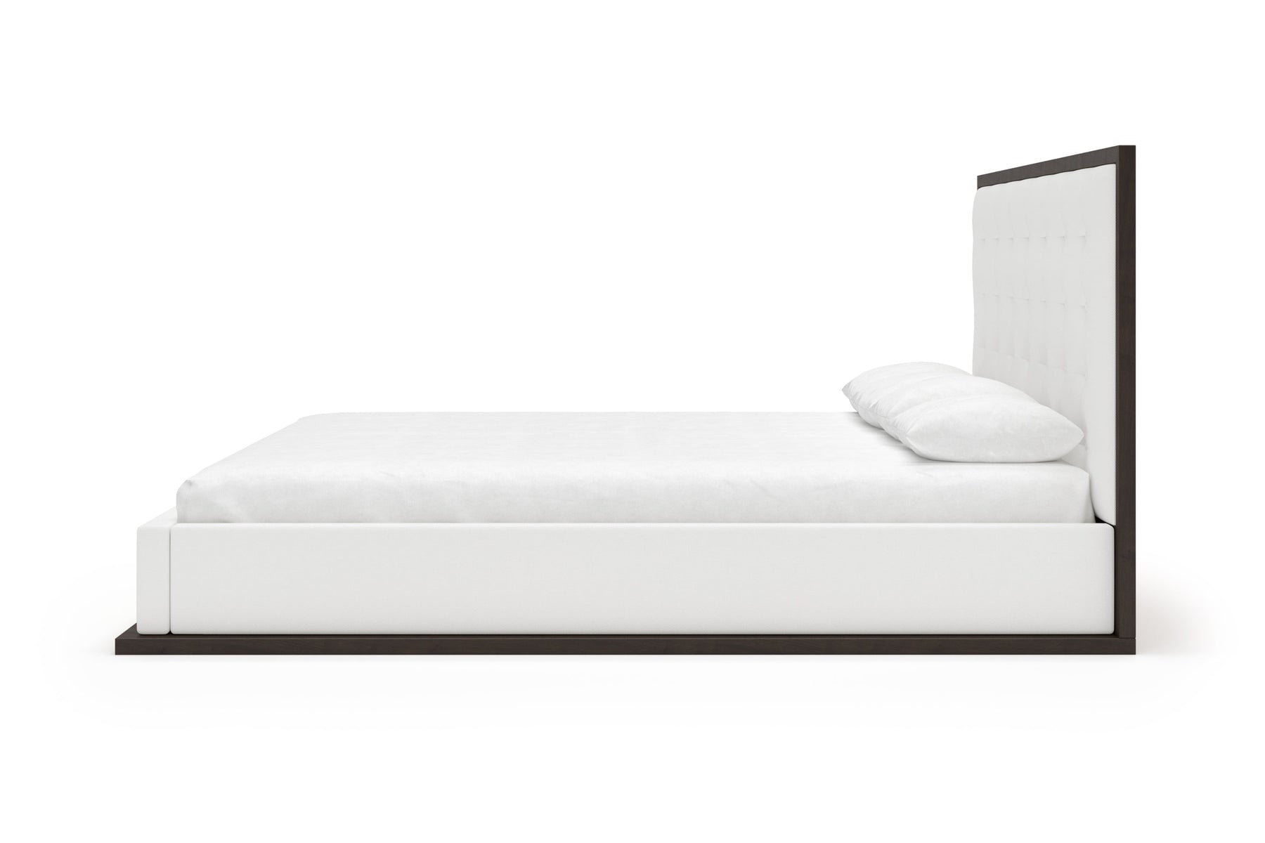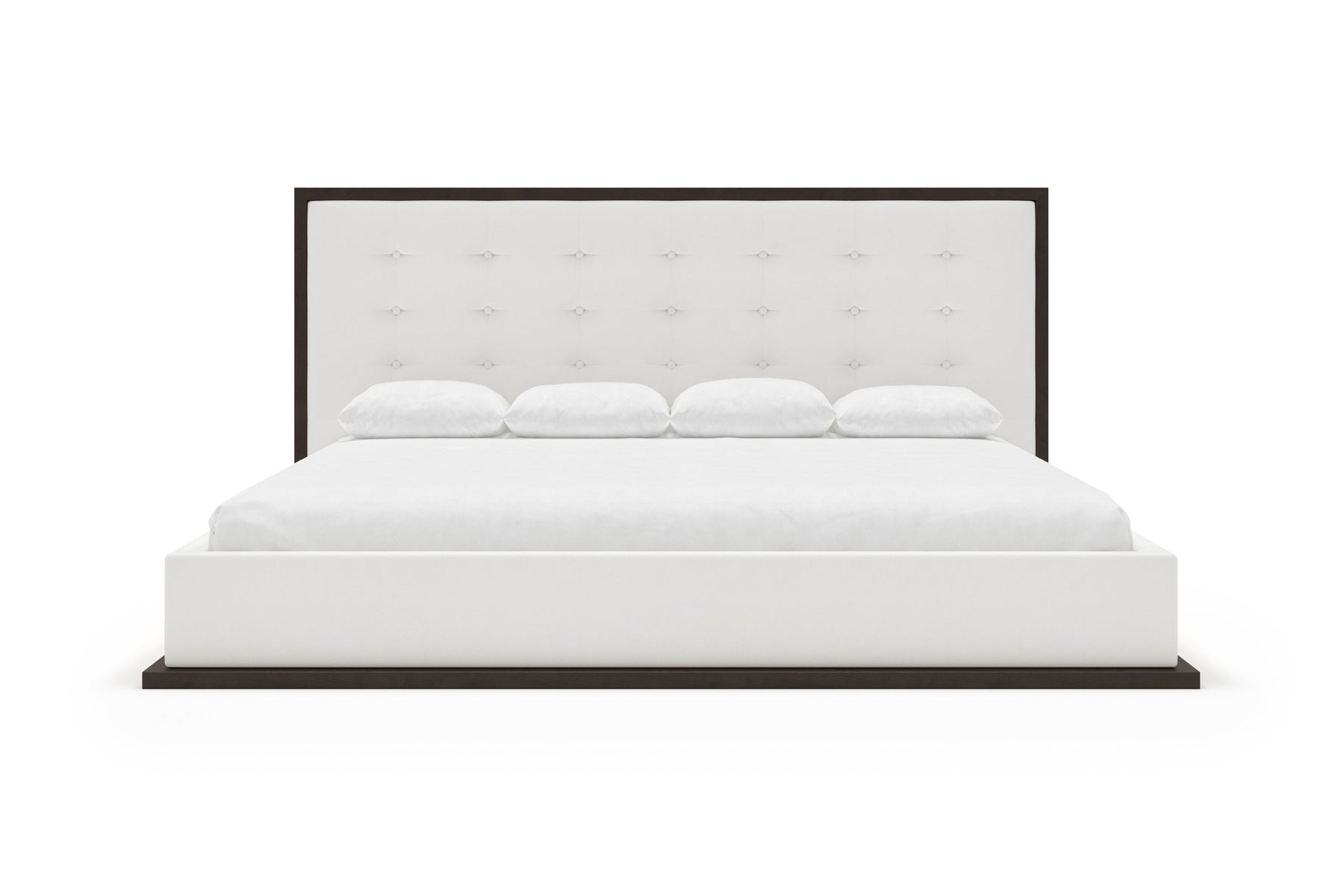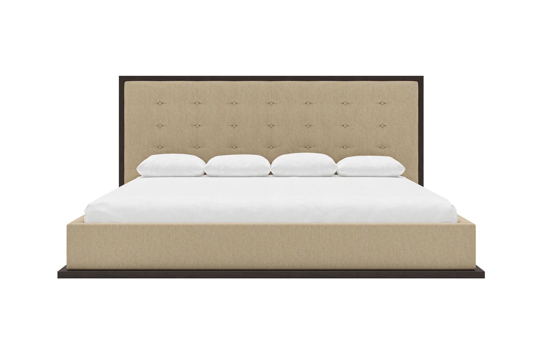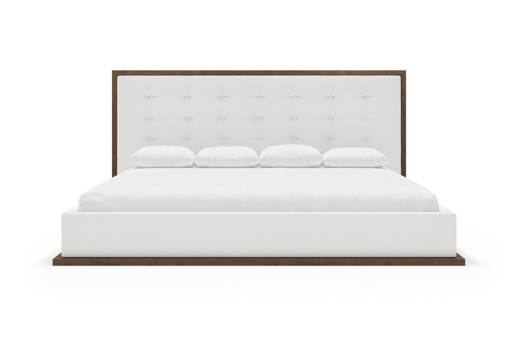 The headboard, framed by a rich, wood border, contrasts beautifully with the plush, tufted upholstery, creating a sophisticated centerpiece in any bedroom.
