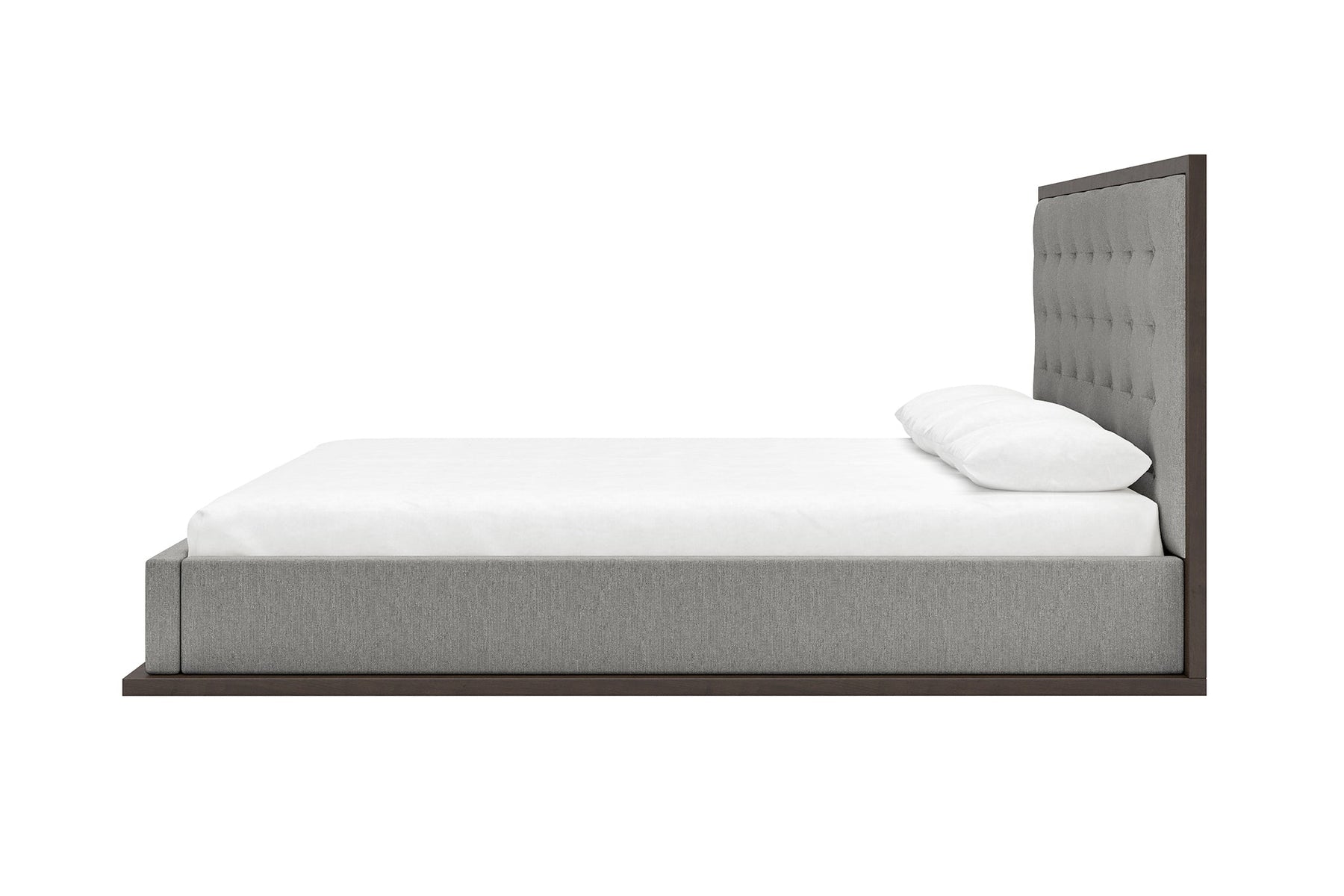 This bed is supported by a sturdy base that matches the wood framing of the headboard, giving the piece a cohesive and grounded appearance. The versatile design suits various decorating styles, from modern and minimalist to transitional and classic.